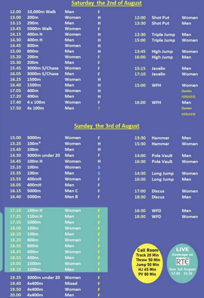 The action begins at 12pm on Saturday. Fans can catch both days live on the Athletics Ireland YouTube channel, with RTÉ providing live coverage from 5pm–7:30pm on Sunday evening.